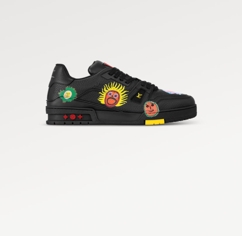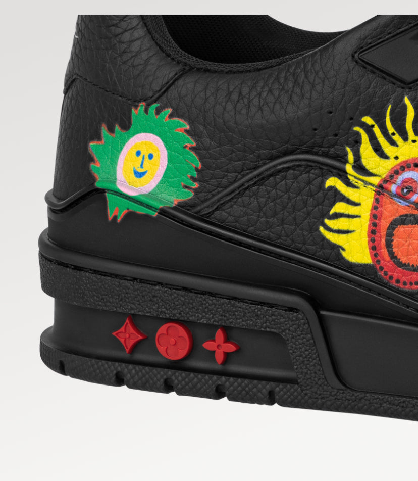 Para a coleção Louis Vuitton x Yayoi Kusama, o LV x YK sneaker LV Trainer é apresentado em couro de vitelo granulado e estampado com diversas imagens coloridas. Esta edição exclusiva faz parte do tema "Faces" da coleção, inspirado na série de pinturas "My Eternal Soul" que a artista começou em 2009. A parte de trás do sneaker traz a assinatura dessa importante colaboração: Louis Vuitton x Yayoi Kusama 2023.